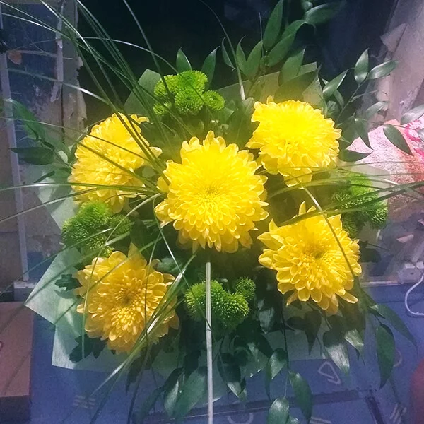 Желтые одноголовые хризантемы составляют центр жизнерадостного букета. Выразительности цветам придают солидаго, салал или рускус. Упакованная в зеленую сетку композиция наверняка порадует получателя в день его рождения. Будьте убеждены, что любой член семьи не устроит перед роскошью букета, будь то Ваши родители или любимые бабушка с дедушкой. Коллега по работе также оценит Ваш безупречный вкус и будет радоваться получению столь шикарного букета. Композиция выразит глубокие чувства благодарности и уважения за Вас.